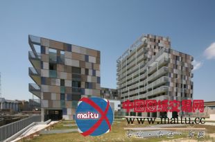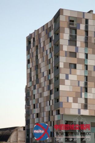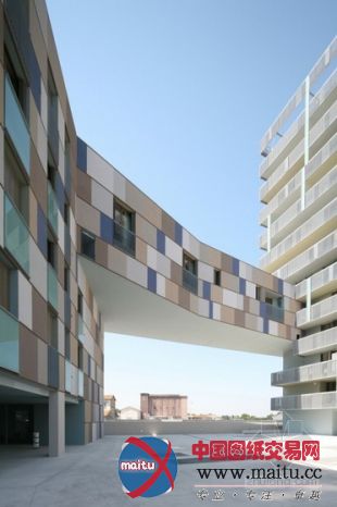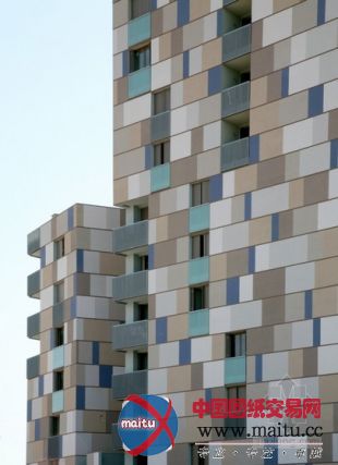 公寓楼的幕墙是由赤土陶瓦模版做成的,每层的幕墙都利用两块模板,如许构成了一种非常热和的幕墙色调,不合色调的黏土色的和钴蓝色的模板共同构成了马赛克的样式,这是略受拉文纳闻名的拜占庭式艺术的影响而如许创作的,这会让人们感触感染大年夜楼的幕墙有一种标量掉真的感触感染。如许,既使大年夜楼与都会和运河相连,同时又为本工程后期项目标扶植做好了预备。