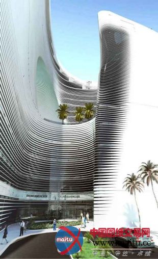 23层高的RF10大年夜厦既是旅店又设有办公楼,将成为将来Kish岛上的一大年夜地标。这座修建从上部看是一个漂泊的U字形,从侧面看也是一个U字形,两个U字形订交构成了一个浮泛,设置了内部平台。立面上多少形的光滑表层仿佛是从内而外发展出来,并赓续转变色采、图案、纹理和启齿。如许的计划既知足了天然光照耀进和天然通风的须要,也为饭店供应了不雅景的窗口。