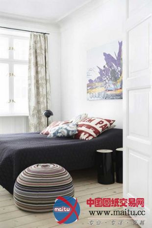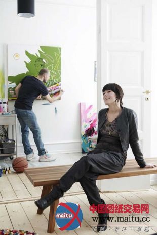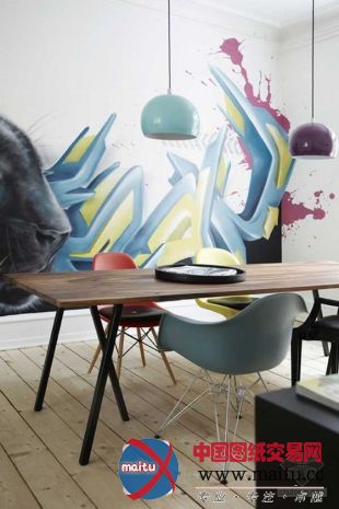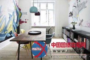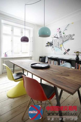 这个公寓位于丹麦,有93平米,公寓的计划很有特色,计划师Christina Eivor Wallem Hvims 和 Frederik Lassen Hesseldahl在他们的的公寓餐厅墙壁上画了黑豹,与周围家具或房屋上美丽色彩构成对比,餐厅椅子上孔雀羽毛形状的扣子使本来普通的家具活泼美不雅。