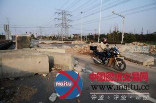 一名周围居夷易近骑着摩托车穿过大年夜桥无锡段进口处的路障。