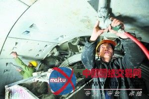 昨天上午,施工人员在地铁14号线向阳公园北湖地道内查抄盾构管片的拼装质量。