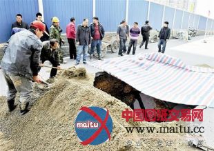 据现场施工人员介绍,经检察,地陷处下方曾埋过某公司的管道,大概回填没有夯实引发,该工地预备将地陷处夯实后用混凝土回填。