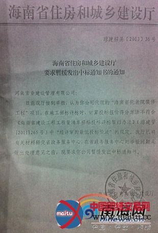 随后,记者从宏业公司出具的琼建招函【2013】36号《省住建厅请求暂缓发出中标关照书的关照》上看到:日前我厅接到举报,觉得你公司代庖署理的工程“海南省某院装修工程项目”,在施工招标评标时,计算投标报价得分方式不符合《海南省扶植工程工程量清单招标投标评标暂行方式》(琼建管[2011]265号)中“经评审的最低投标价法”的划定。我厅已将有关材料转交省政务办事中心,在省政务办事中心对举报问题未做出措置定见之前,现请求你公司暂缓发出中标关照书。