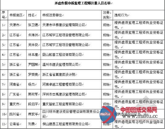 传递称,经查,张卫德等11人在申报监理工程师注册过程中,捏造有关证件,供给子虚材料。为加强注册执业治理,按照《注册监理工程师治理划定》(扶植部令第147号)的有关划定,现对张卫德等11人捏造有关证件,供给子虚材料申请注册的背规行动赐与传递攻讦,一年内不受理其注册申请,并将其不良行动在全国建筑市场诚信信息平台上予以发布,记进诺言档案。