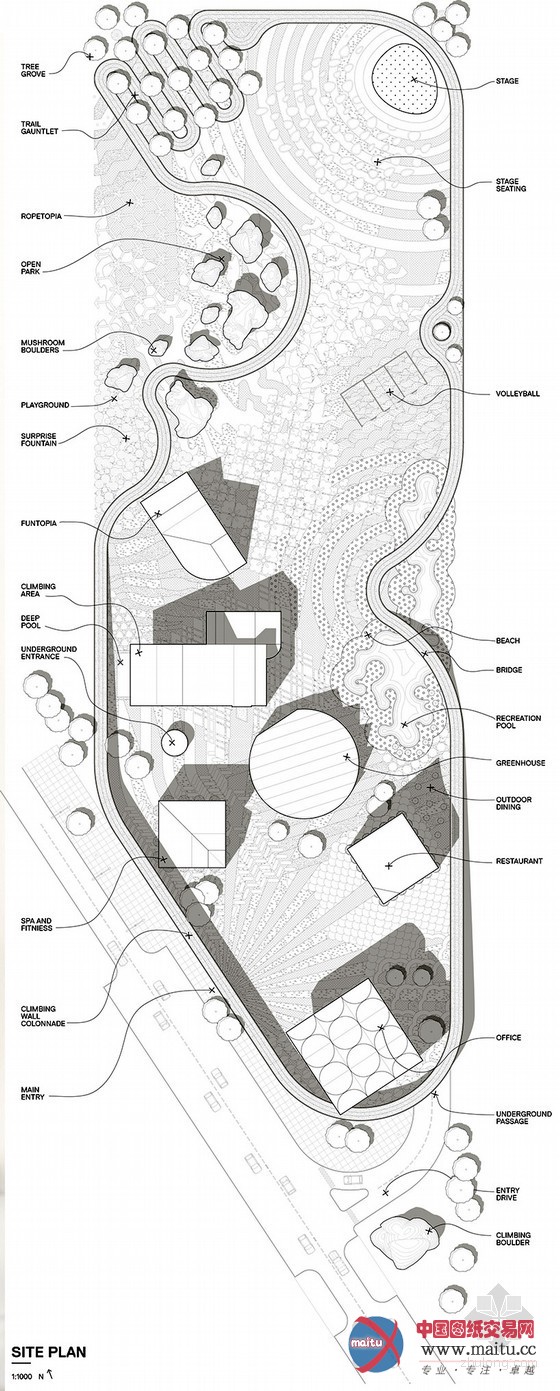 在地区特点的影响下,这份设计项目操纵人倾斜的屋顶来产生巨大年夜的体量感和趣味感。这座勾当中间经由过程富有纹理感、色采明快的外壳促进了整体的梦幻感。这片区域利用了形态各别的图案和材料,如许为旅客供给了攀爬、小憩或即兴跳舞的空间。六座主体建筑包括了办公室、温泉浴、健身房、餐厅、温室、攀岩墙、多功能厅、泊车场和最令人兴奋的地下“游乐桃源”,彼此之间通太轻松的车行通道相连接。一公约750米长的道路将各类空间串连在一路。在场地的最南端,这条道路延长进了一片墙体,打开了通览外部世界的窗口。而在内部,这片场地由一块30平方米摆布的网格将六座单体建筑连接在了一路,它们乃至与一些附加的室外项目慎密地联系起来。