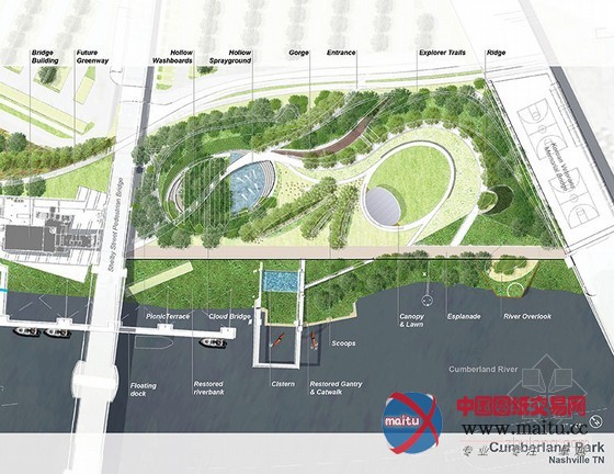 设计的灵感来历于田纳西州的不合地质环境,这里的地舆环境供给了所有所需要的东西,包含水、阳光、石头、滚草、树木、山脉和山谷。设计师把这些元素全数集中到一个城市公共景不雅傍边,经由过程有趣的教育,激起孩子们的想象力。对传统和风尚进行立异而成的游乐器械创作发现了一个游乐柱,合适所有春秋人群。在公园里,每小我都将体验到不合的东西,设计师鼓动鼓励人们介入自由并且有序的比赛、勘察、进修、探险等勾当,建立环保意识。这个项目将烧毁的场合和建筑物改变成了布满活力和地舆多样化的绿色空间,因为2010年田纳西州洪水泛滥,基址和河道的关系变得十分的敏感,设计团队曾与美国陆兵工程兵团一路研究,确保公园将不再蒙受洪水的侵蚀,洪水呵护区不需要再举高洪水位或削减洪水存储。公园恢复了本来的河岸,削减了60%的透露在外的路面,原生植物生物多样性增加100%,利用本地的材料和经销商刺激了本地经济,获得了3785411升摆布的雨水可以用来从头浇灌。社区在2010年签订了河边地区振兴打算,希看坎伯兰公园可以或许供给更多休闲的机缘,新型的表示空间,成为城市和经济中必不成少的一部门。坎伯兰公园和桥梁大年夜厦被觉得是已预备伏贴的项目,他们将会给社区供给良多的公共好处。