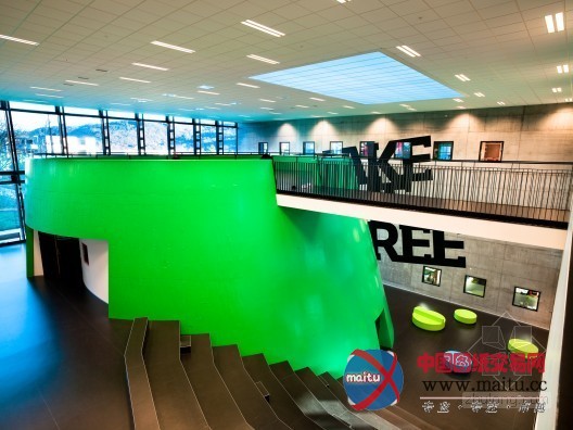 他们在设计的时辰高度存眷的是环境标题问题和建筑可以或许遍及操纵。坐落在挪威西海岸的城市卑尔根有着漫长冬季,一年里大年夜约240天都有降水,供给一个进修和文娱勾当的抱负场合成了设计师的首要目标。该建筑有两个彼此有联系的定位:一个是活动,一个是教育。建筑由铜皮环绕,嵌有彩色的玻璃幕墙,为建筑带来活力。一个几近透明的外墙充分操纵了太阳光,彩色玻璃门窗随机摆列,重点地区的家具举措措施随便摆放,构成友爱的室内空气。进口大年夜厅是建筑的的中间神经,连接着不合的研究室和公共歇息室。