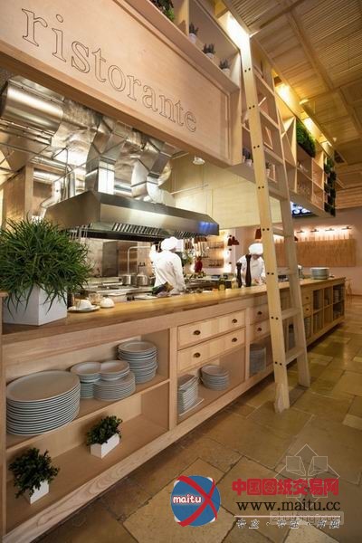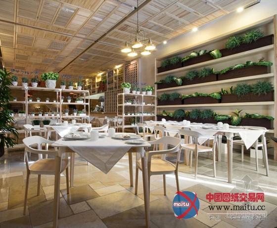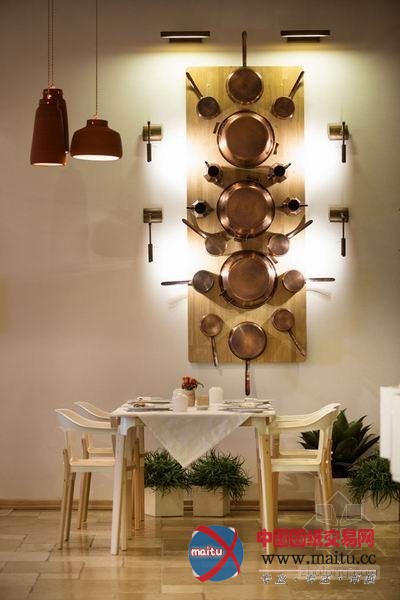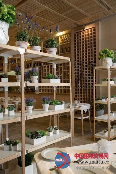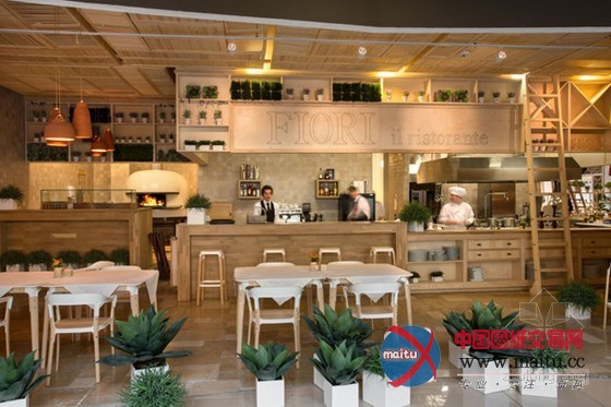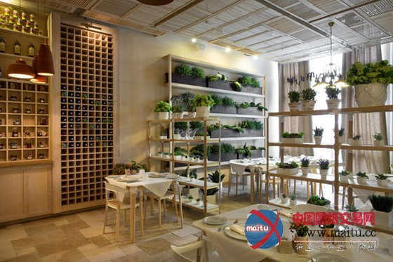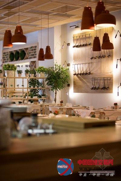 乌克兰基辅FIORI餐厅设计,餐厅店面装潢环保有趣,纯木质的空间装潢精练,淡色的空间格调加以明快的花草色采,达到惊人的视觉享受。天花板用大年夜小外形各别的木板拼接起来,纹理详实,做工精美。空间里有良多储物格,无一例外埠放上了小盆绿植,视觉结果很是惊人,墙上的装潢则加倍朴素原始,很合适餐厅的本质。
