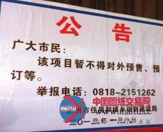 在B幢售楼门口,一块达州住建局的通知布告提示“广大年夜市平易近,该项目暂不得对外预售、预订等”,并留下了举报德律风。落款时候为“二〇一三年一月八日”,此中“二〇一三”和“一月八日”傍边的数字,较着为手写后贴上往的。在售房部里面有一样通知布告,落款时候为“二〇一二年十二月三十日”。工作人员诠释“改起耍”,不影响大年夜家买房。