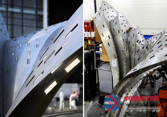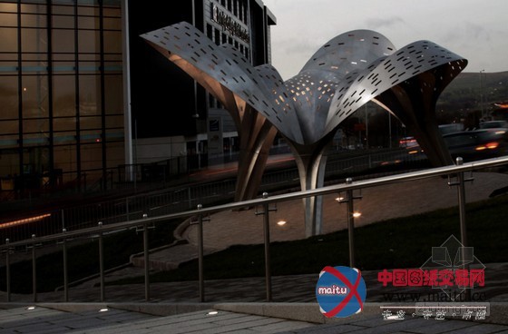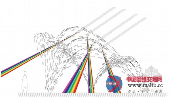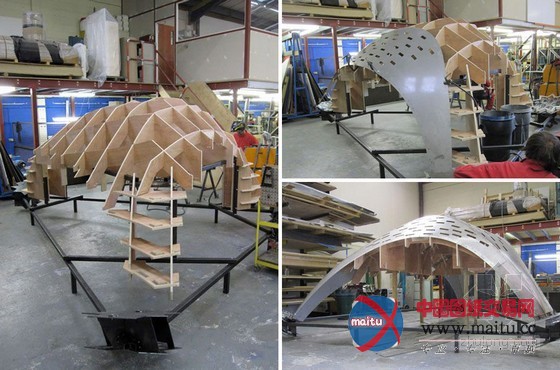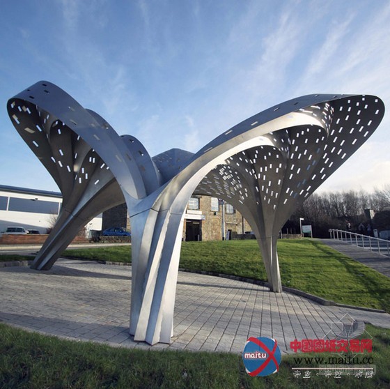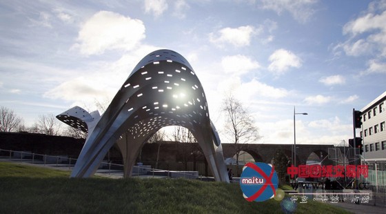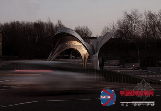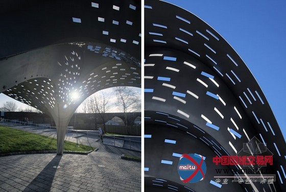 在伯恩利学院的门前、三条大年夜路的交汇点,这座尽是孔隙的钢体以曲线勾勒出交通联系的形象。雨滴的敲打声在金属上回响,当雨水堆积成束从亭子上的凹槽流下时,嵌进在孔隙中的透镜将会捕获阳光并将其打散为彩虹光谱并投影到地面上。暂且不谈光谱的多彩班驳,建筑师们与Arup公司的工程师们还倡导一种称为“外壳花边”的布局系统——一种取形于天然并且经由过程对材料的最优化来构成轻量化且具有自我撑持性的情势。经由过程整合数字制造手艺和建模手艺,和加强海洋贝壳的分层几何层次,这个作品兼具曲线感与力量的波纹感,而这也削减了非承重层的材料利用。这使得这座亭子在具有活力外表的环境下也具有高效的建造布局。