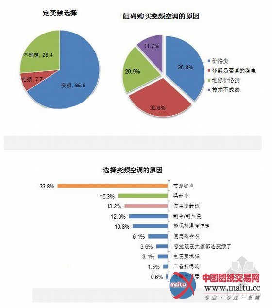 65.9%的消费者偏向于采办变频空调,他们选择变频空调最首要启事是节能省电,其次是噪音小。也有30.6%的消费者因为担忧变频空调是不是真省电,对他们采办变频空调的决定计划产生了阻碍。是以我们建议空调厂家在变频空调发卖过程中,因该拿出令消费者佩服的省电数据指标来加强产品说服力。