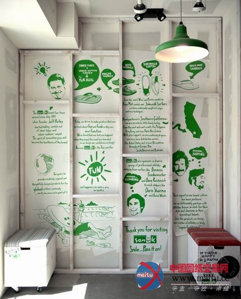 Sanuk 的第一家旗舰店,采取了新颖的创作理念——车库灵感的主题,给人们充分阐扬的乐趣,可以更乱一些、更吵一些,这里是解缆的处所,也是衣锦还乡的处所,通往欢愉路程的所有东西这里都能找到。以车库灵感的主题Sanuk旗舰店面设计的装潢看似混乱,却布满了一种财产的清爽感。