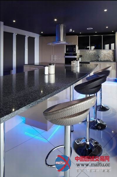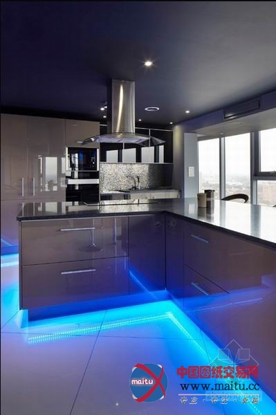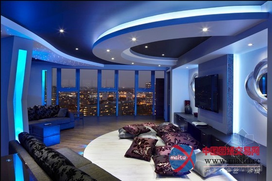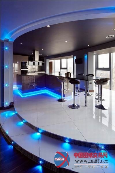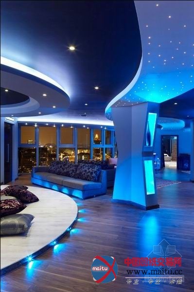 伦敦现代气焰公寓设计这是一款室表里奇妙连络的设计,全部建筑是向内曲折的造型,是以室内设计也基于这个造型展开。蜿蜒的带状吊顶搭配莹蓝色灯光好像一条闪闪勾当的银河,家具下部也安装了照明,整体十分梦幻。软装的选择趋于冷硬的线条,更突显了科技感和将来感。