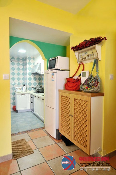 色彩还是灿艳,明黄色的墙壁与绿色的墙壁连络,方块状的瓷砖,构成了全部空间的主界面。 墙壁还用了马赛克,昂贵的马赛克,不外为了斑斓,仍是豁出往了。设计上多立异,门是用的拱形门,别致奇特。厨房,倒没有那么多繁复的色采,可是打造得很是清爽,色彩看上往很是舒畅,乳白色加上绿色,如斯令人舒畅的色彩,这是大年夜天然的色采,而各类物件摆放的也较为整洁,看上往干清干净的。
