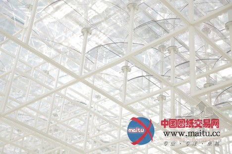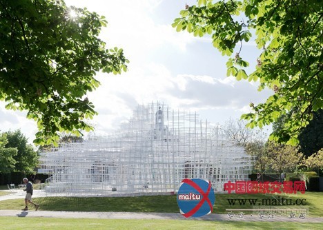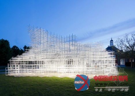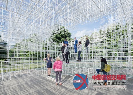“我的设计灵感来自于周围美好的环境,”设计师介绍说,“我被肯辛顿公园的绿色环境深深传染,希看创作发现出一种介于天然和建筑之间的透明的绿色建筑空间,尽可能地融进周围的绿色大年夜布景中。” 为了实现这个方针,他用了白色的钢柱来造这个亭子,跟着柱子漫衍密度的改变,人不雅察角度的不合,全部建筑的透明度不竭改变。“钢柱本身是十分坚固和人工化的,”设计师说到,“可是当我们把无数的钢柱组合到一路,他们变成了有机的、像云或丛林一样的建筑。而我本人也被这类奇奥的组合结果所吸引。” 藤本流露,接下来的工作主如果考虑亭子内部的遮雨标题问题。“我们不克不及直接在上面放一个屋顶,这会粉碎这个美好的建筑。最后决定只用透明的聚碳酸酯光盘,嵌进每个柱网单位,来解决遮雨标题问题。”而这类聚碳酸酯的“瓦片”,不但可以遮雨,轻风拂过时,还能轻轻摆动,让氛围加倍柔和斑斓。