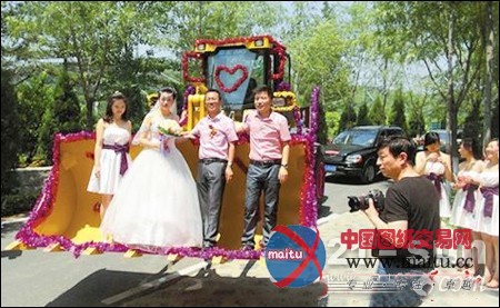 6月13日,在晋城市生态旅游村洞头村,一场大年夜型露天婚礼浪漫上演,由16台装载机构成的婚车车队,成为当天最大年夜亮点。新娘毋江豫在晋城市长江实业公司工作,每天都与装载机打交道,新婚时她特意提出用装载机作婚车,为他们漫漫人活路留下一段亘古常新的甜美记忆。图为新郎新娘及伴郎伴娘在婚车上合影纪念。