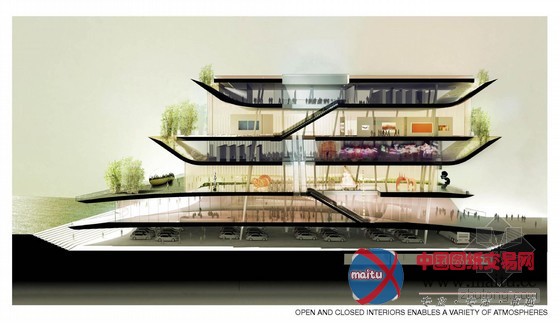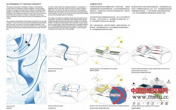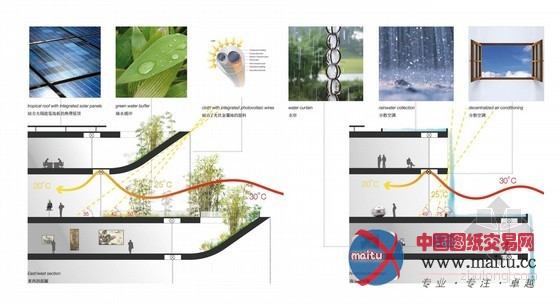 方案设计的其它特点成立在台湾地区的日照路径上。夏季正午时候,太阳位置与地面几近成直,而建筑的东、西立面只有在早上和下战书有晖映阳光。为此,在东-西轴设计了巨型顶棚。为了进一步地削减阳光直射,设计方案同化应用植物和一种由布料建造的外表皮构成缓冲区。东、西立面的布料表皮整合了光伏网格,用于为建筑出产能源。北、南立面的布料外表皮则成为降雨排水系统。