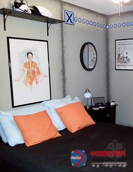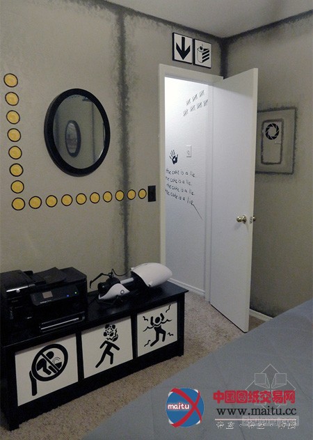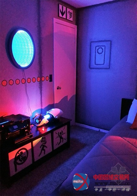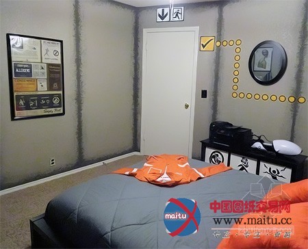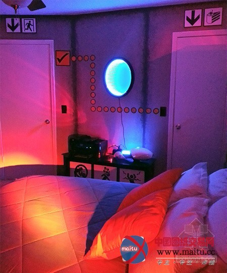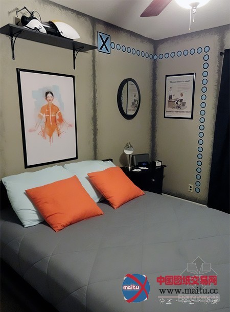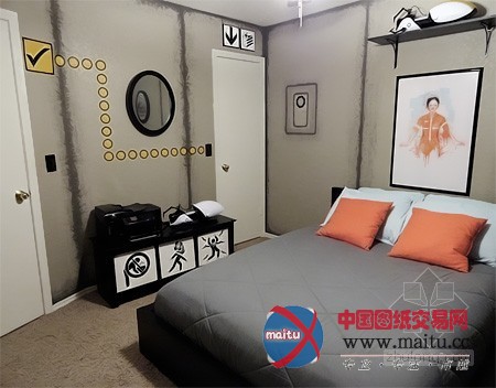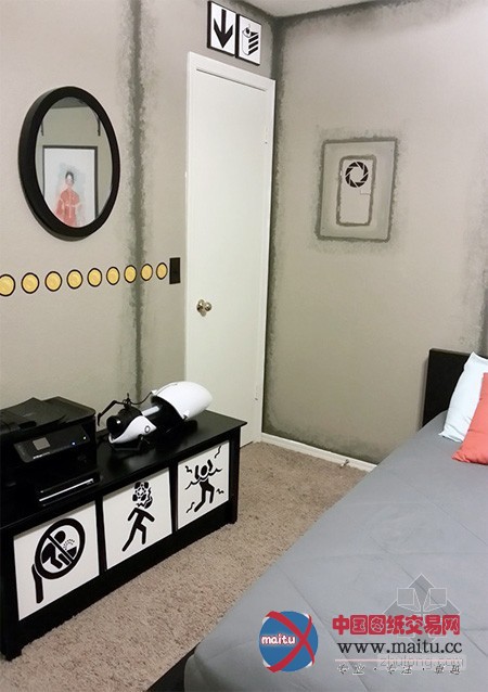 传送门主题卧室装修设计,Lauren Jennings将她的卧室打造成了传送门(一款收集游戏)主题卧室,创作发现性的卧室布满了海报,标记和来自传送门1、传送门2中的经典图案。开灯时,镜子会变成橙色和蓝色的传送门。别的,卧室里也有《传送门》的周边,书挡、马克杯和墙贴等。传送门卧室是最完美的测试场地,拿起你的传送门枪吧!译者:筑龙网 丢丢