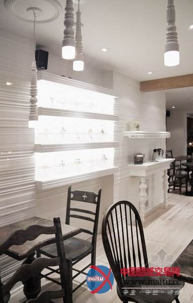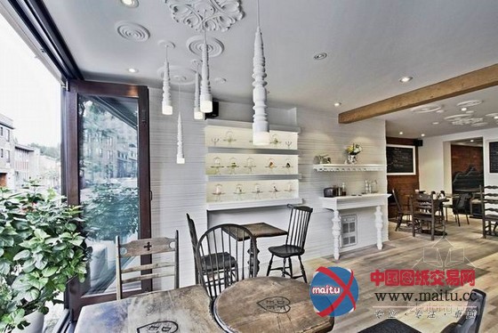 位于加拿大年夜蒙特利尔的De farine&deau frache咖啡厅,设计师的理念是布满爱,无邪,远离世俗。餐厅整体以白色为主,做旧的外形不一的深色桌椅,配上定制的木条墙壁,仿佛是在布满原始的丛林里,一个个精美的玻璃器皿装着的糕点,还有印制着标识表记标帜的饰物,又在奉告人们,这是一家可以轻松享受的咖啡厅。