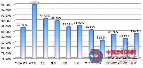 我们经由过程一建各专业考生的测验经由过程率,可以反应出该专业测验的难度。经由过程率越高的专业测验难度越低。