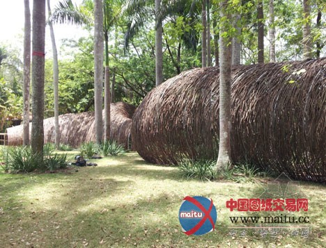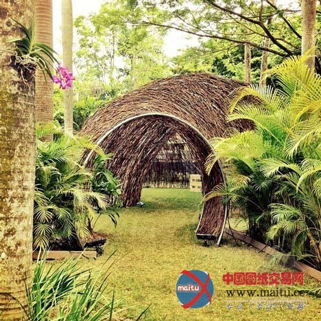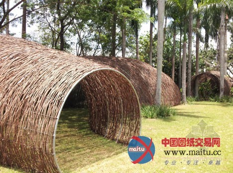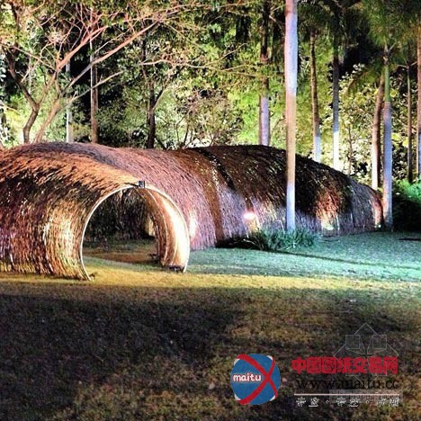 设计师与一群圣多明哥本地的工匠合作,应用编织藤框的传统工艺,以藤条环抱纠缠着一系列的弧形金属骨架来构建两个蒲伏在草地上的地道。此中一个建成的布局还配有木地板,地面灯光和绿植。全部项目耗时六周建成。