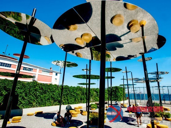 这是由SOArchitecture设计的 –天空黑点憩息空间。位于博斯普鲁斯海峡的进口,这个项目是土耳其伊斯坦布尔现代艺术馆2013年青年建筑师打算的一部门。设计师希看在伊斯坦布尔这座古老城市的喧哗街道上创作发现一个荒僻冷僻的歇息空间,圆盘形的反光顶棚聘请人们进来坐、歇息、集会、玩耍和仰看天空。
