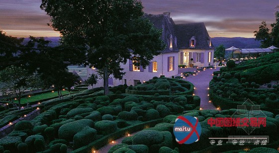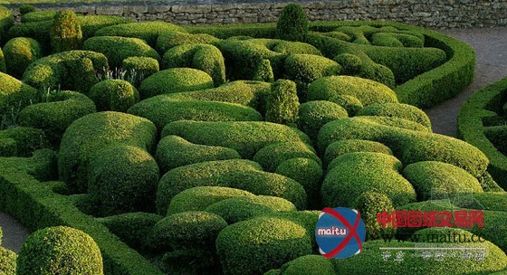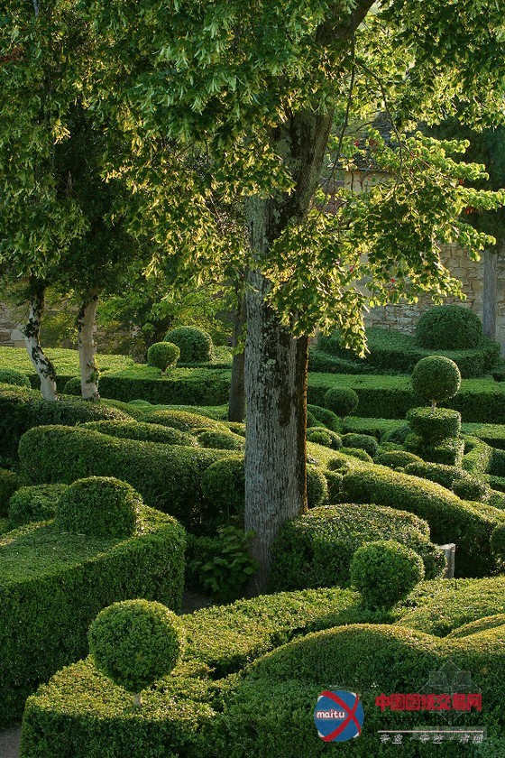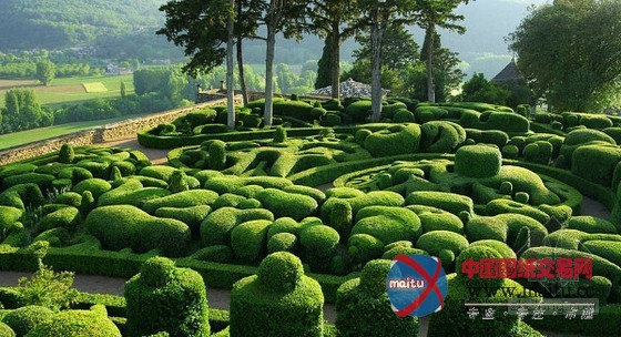 这是由法国园艺师于300年前设计的玛琪萨克(Marqueyssac)花圃。属于法国多尔多涅峡谷(Dordogne valley)周围的一个古老城堡。相传花圃建于17世纪,此刻人们看到的造型仍然是遵循300多年前的手稿进行修剪和保养的,由四位花匠精心保护着。