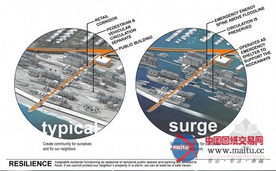 这一项目被称为“一个有弹性的Rockway”(FAR ROC):经由过程几个小平台进步地面的水安然安静供给额外呵护的土丘。在海平面上升的环境下,一个作为根本设计的地盘将呵护这一地区。为了削减填充的质量,按照地球在布局上是圆的,如许就利于构成一个正弦波将其全数包含。设计别的包含了救济通道,在天然灾害到临的时辰,可以起到优化排水的结果。他们由高架道路连接,此中包含在正常环境下作为商业街的中间轴,和告急环境下的一个出口道路。
