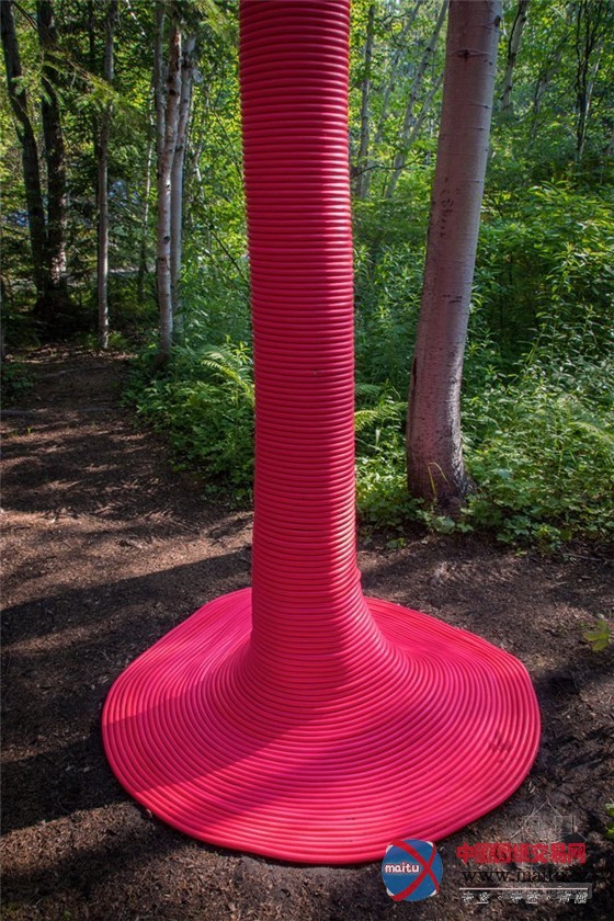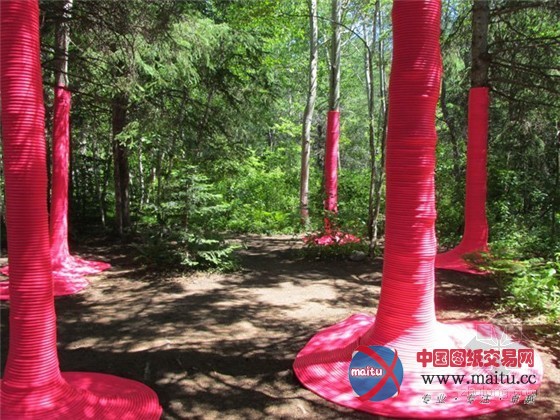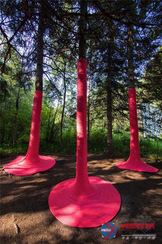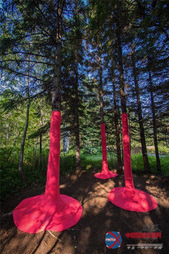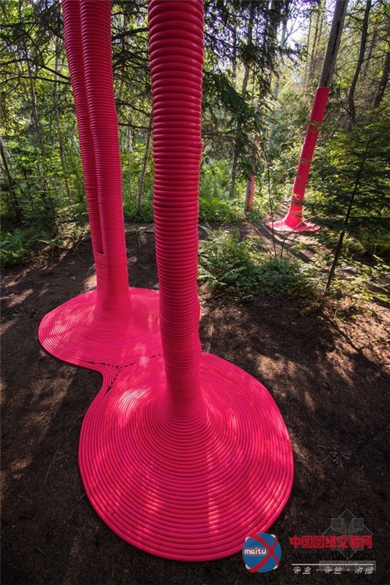 中文:粉色的矛盾触犯 英文:Pink Punch by Nick Croft and Michaela MacLeod 在2013年加拿大年夜魁北克天堂花圃中进行的国际花圃节上,设计师Nick Croft 和 Michaela MacLeod推出了他们共同设计的“粉色矛盾触犯”作品。这一设计旨在用狠恶夺目标粉色,操纵树干的造型,吸引旅客经由过程荒僻的巷子,进进丛林深处。设计采取传统的裹树手艺(用于呵护树木,抵当天然的侵害),采取敞亮的粉红色,用非传统的编制来辨别“原始”的丛林。这些粉色的绳子由天然橡胶乳胶制成,环抱纠缠到树干的10英尺(约3米)高处,然后继续在地面上盘出直径3-4英尺(0.9-1.2米)的圆盘。每小群树木被缠在一路,在树下可觉得行人供给歇息之所。 译者:筑龙网 温冷僻秋