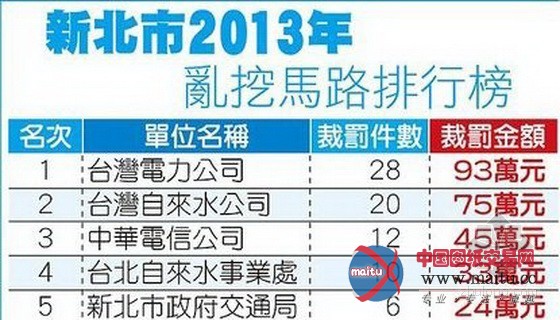 据台湾媒体报导,台湾新北市当局统计的2013年上半年道路发掘工程开罚数据显示,在总计开出的上百张罚单中,台湾电力公司公司蝉联第一名,挨罚金额近百万元新台币。台湾自来水公司与台湾中华电信紧随厥后,背规样态以未于刻日内修复路面为最多,逼近总件数一半。 岛内有平易近众不满地觉得,“公营企业用平易近众纳税钱缴罚单当然不怕!”对此,台电暗示,已慢慢打算改良方案。