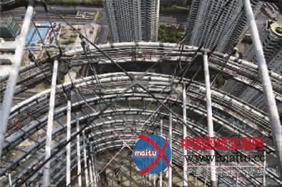 第三大年夜难关是幕墙撑持系统的安装。针对该工程为表里双层幕墙系统,外幕墙柔性钢撑持悬挑距离大年夜,安装时把持者脚下无楼面,悬空功课必然会增加定位把持难度,钢撑持构件和节点支座又是机械精加工尺度,使得安装难度进一步增加等坚苦,机施集体的手艺人员立异思路,造“船”渡难关,成功研制出吊挂式整体施工平台。2000平方米的黄色起落平台经由过程拉索吊挂,紧贴改变改变的大年夜楼主体布局腾空环抱。在这个“如履平地”的“飞船”上,施工把持人员可以“踏结结实”地完成钢撑持系统吊装、空间测量定位、精度调剂、幕墙转接件的切肯定位等几近所有的施工任务,为外幕墙系统的图纸变实际供给了最靠得住的保障。