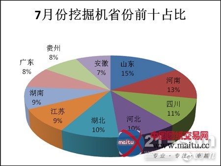中国工程机械商贸网产品中间数据显示,7月发掘机订单排名前十名的省分别离是山东、河南、四川、河北、湖北、江苏、湖南、广东、贵州、安徽。