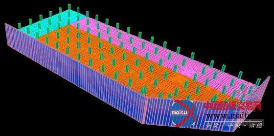 这是局部有限元网格化分,因为柱位和锚杆的错位,对网格化分的切确性要求很高,SAP2000本身不具有很好的主动化网格剖分功能,是以也费时候。