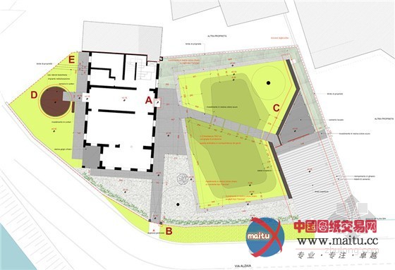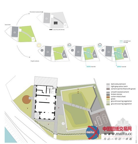 遵循处所当局建筑律例,车库下的管道必需连接20立方米储(雨)水箱。花圃设计上尽可能削减了水泥利用,取而代之的是,大年夜面积的地盘来接收多余的雨水。出于这个启事,图上所显示的白线对应的是排水道,当水溢出排水线时,水可以或许流到花圃草坪上。可以看到在地面上的排水线是沿着道路展路砖,通向车库和房屋。