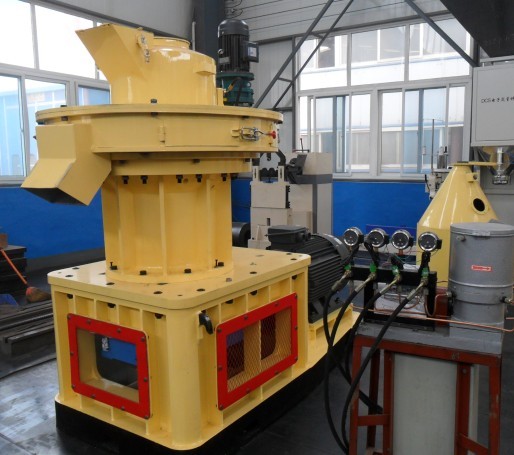 特点:1.模具向上,结构独特,垂直进料,利于散热:模具向上、水平放置、垂直进料到制粒室,物料直接到位,不需要其他助力装置。垂直环模制粒机进料口侧装,比重轻的物料进制粒室困难,需要特别装置强迫推进且不均匀,最主要是制粒室不能散热降温制约了传动系统(齿轮、轴承)的寿命。平模制粒机有两种结构,虽能垂直进料,但都存在诸多难以解除的弊端。(1)模盘旋转,擦动压轮结构的平模制粒机,物料容易起拱,造成进料不均,影响产量。(2)模盘静止,压轮旋转,虽不起拱,但产生了离心力,把进到制粒室的物料甩到周边,使制粒孔朝上且孔分布均匀的平板模具中心无料压制,造成物料堆积,薄厚不均。