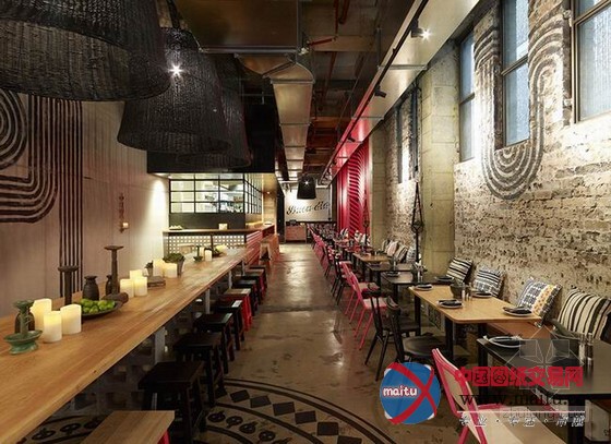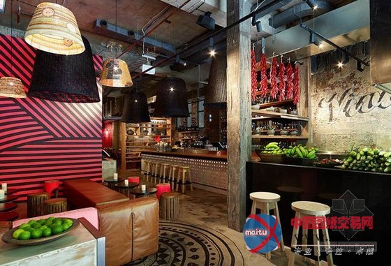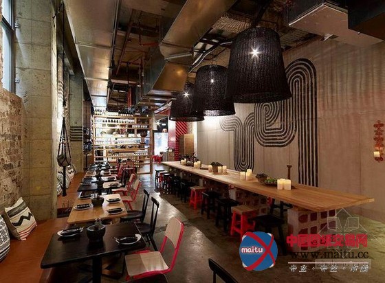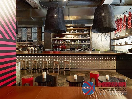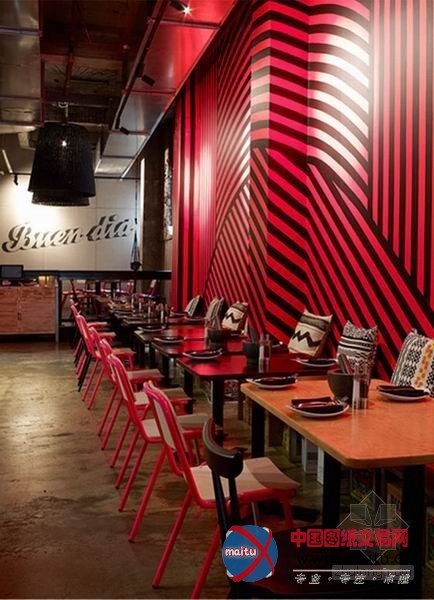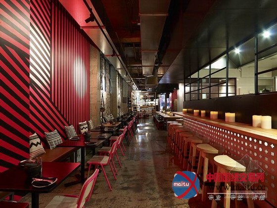 悉尼的墨西哥Mejico餐厅装修,整面红黑相间的条纹墙带来强大年夜的视觉冲击力,红和黑色的椅子也在相呼应,空间一样用到了木质材料,配上奇特的吊灯,全部空间布满***。