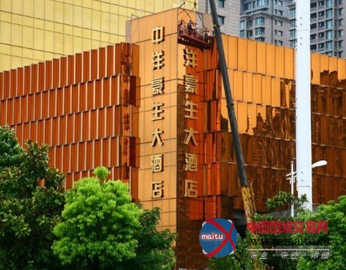 从该建筑招牌和鼓吹告白看,是一家(白金五星级)酒店,店名为“中洋豪生大年夜酒店”,该酒店总面积12万平方米,主楼48层,高200米,总投资15亿元。不单内设各类豪华配套举措措施,在楼顶还建有直升机停机坪。