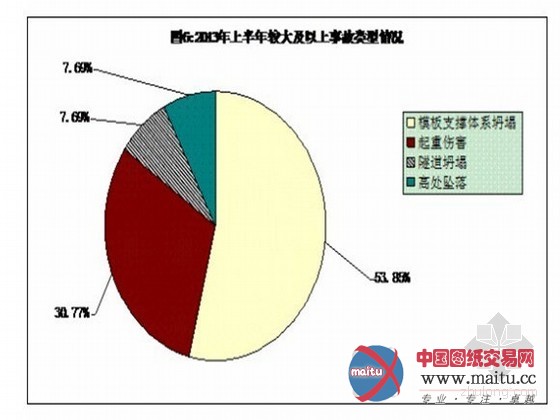 2013年上半年共产生13起较大年夜变乱,此中模板撑持系统坍塌变乱7起,灭亡30人,别离占较大年夜变乱总数的53.85%和56.60%;起重机械变乱4起,灭亡15人,别离占较大年夜变乱总数的30.77%和28.30%;地道坍塌变乱1起,灭亡5人,别离占较大年夜变乱总数的7.69%和9.43%;高处坠落变乱1起,灭亡3人,别离占较大年夜变乱总数的7.69%和5.66%。