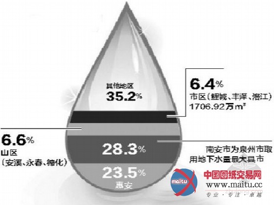 据统计,泉州市2011年全年取用地下水量26651.73万m3。市区(鲤城、丰泽、洛江)为1706.92万m3,仅占6.4%,用水量起码。山区(安溪、永春、德化)排第二,占6.6%。取水量较大年夜的有沿海的泉港、惠安、石狮、晋江、南安,此中,南安市为泉州市取用地下水量最大年夜县市,占全部泉州市地下水用水量的28.3%,其次为惠安县,占23.5%,二者占近一半。