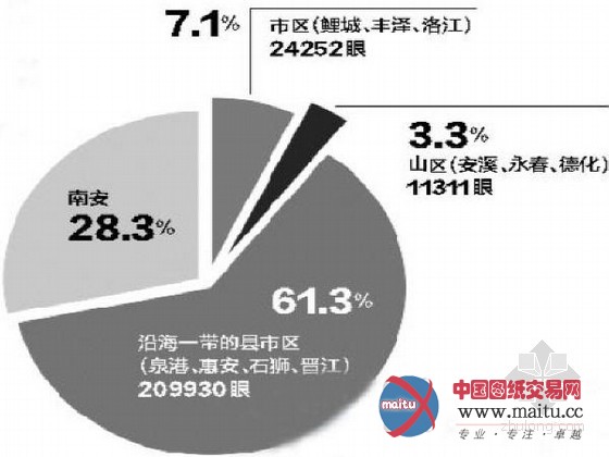 按照泉州水利普查数据显示,泉州共有地下水取水井342422眼,此中市区(鲤城、丰泽、洛江)共24252眼,占7.1%;山区(安溪、永春、德化)共11311眼,仅占3.3%;而沿海一带的县市区(泉港、惠安、石狮、晋江)共209930眼,占61.3%;靠海又靠山的南安占28.3%。数据显示,泉州地下水取水井眼最多的是惠安县,其次是南安,二者占61.7%。