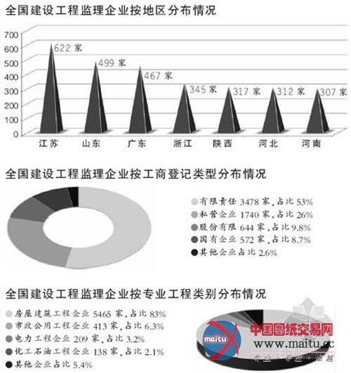 别的,据体味,2012年全国共有6605个扶植工程监理企业插手了统计,与上年比拟增加1.43%。按地区漫衍环境来看,江苏省占比最大年夜,共622家;按工商挂号类型漫衍环境来看,有限责任公司占比最大年夜,共3478家;按专业工程类别漫衍环境来看,房屋建筑工程类占比最大年夜,共5465家。