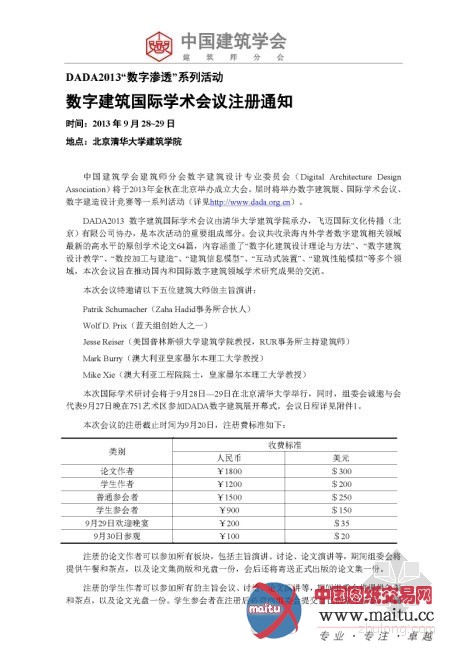摘要:金秋9月DADA2013数字建筑设计国际会议将在清华建筑学院召开。国表里数字建筑专家齐聚北京,共探数字设计将来。Patrik Schumacher、Jesse Reiser、Wolf D. Prix、Mark Burry大年夜师讲座与您相约。更有DADA数字建筑展将于751D·PARK北京时尚设计广场揭幕,敬请存眷。详情请见海报。