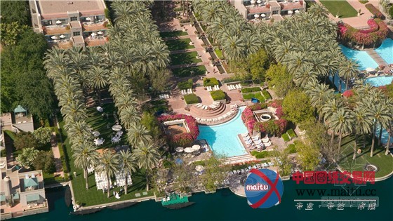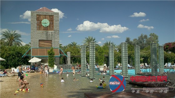 它占地28亩,是现有度假社区整体打算的一个部门。高尔夫球场和湖泊是原本的。雇主希看有水上花圃和具有人造假山和索桥的热带公园,可是设计师说服雇主来利用复古南美主题以便更合适戈壁环境。成排的椰枣树减轻了大年夜范围的扶植,并且延长到了景不雅和假山的框架取景和棕榈树下的房屋间。一条排沟渠,水亭和帐篷供给了电枢,同时带来了水流下落的步行体验。这些元素一样供给给了酒吧,水滑梯和水疗中间。别的,水花圃附加了6个天井来给草坪游戏,恬静花圃和抵达区供给区域。除现有湖泊和雇首要求的20,000平方英尺的泅水池以外,水的用量被降至最低。草坪只在户外需要的处所利用。其他的莳植利用了耐旱的戈壁植物。利用了摩尔人传统的水利举措措施,窄浅的水槽,小量的喷水器和小型的重力喷泉。