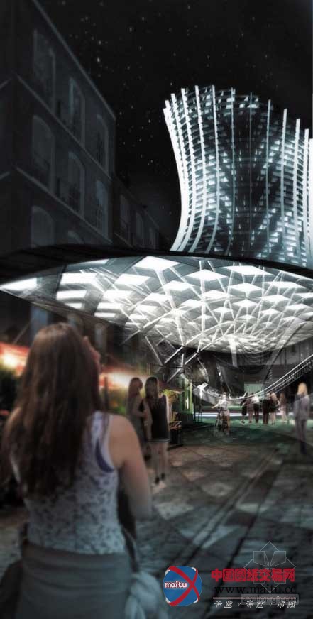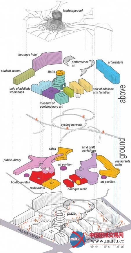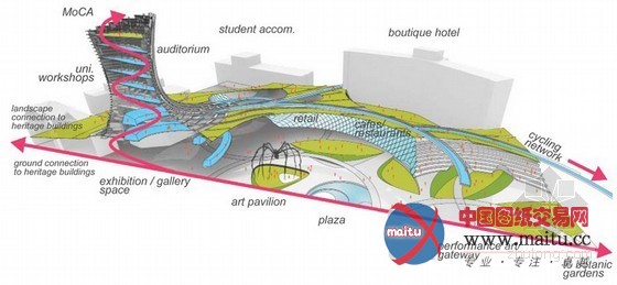 该设计由几位年青的设计师Esan Rahmani 和littleBIGdesignlab共同协作。打算是将这个文化中间城市——阿德莱德建成一个当代艺术博物馆和一个具有现代文化意义的建筑,同时还可以充当作一个城市的植物园。建筑地址在城市的交叉路口,触及到健康、福利、教育、文化和文娱这几种不合的范畴,设计师在此根本上打算创作发现这个艺术文化公园,供给一组周全的举措措施,包含艺术博物馆,画廊,创意空间工作室,世界级设计会议场合,车间设计区,和零售和商业区域。建筑周围还设有广场和自行车走道等,这些周边举措措施和配套将与建筑本身构成一个半封锁式的布局。
