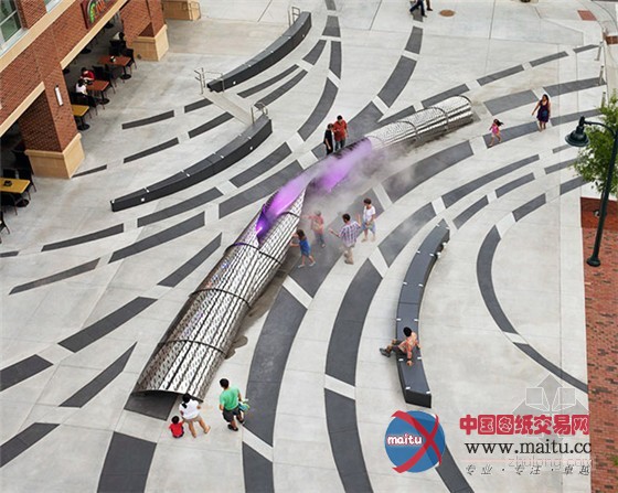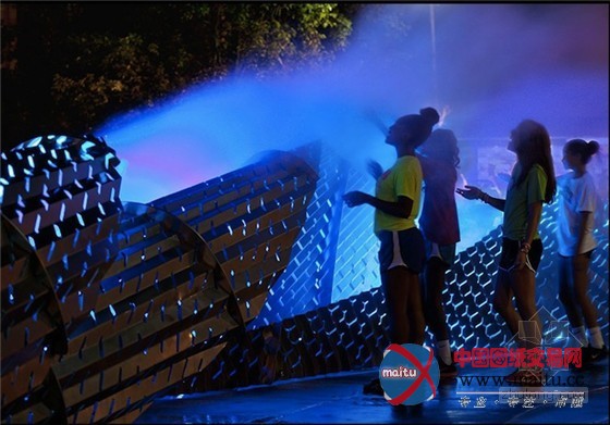 这是由Mikyoung Kim设计的美国北卡罗来纳州教堂山发光蛇形设计。与2013年完成,位于教堂山市中间的一座公共广场上,是新型的视觉艺术雕塑,名为“梦醒时分”。这是一个发光的不锈钢长蛇喷雾装配,长约70英尺,艳丽的光华和梦幻的雾气吸引良多眼球。蛇形的折叠状金属概况下吟唱着释放雾气的喷雾管,伴跟着10分钟的LED灯光秀轮回,在雾气中,该装配一向变幻着多种光华。在酷热的夏季,蛇形设计内的喷雾广受欢迎,在最初的设计理念中,这是为响应周围的水文要素。最首要的是,该装配作为雨水治理系统,可以帮忙削减广场上的雨水径流。