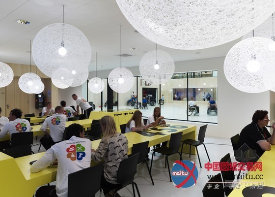 体育黉舍内部除根本讲堂觉得还包含泅水池、室内体育举措措施和一个15米高的攀岩墙。其它举措措施还有一个食堂、多媒体藏书楼,体育尝试室和一个泊车场。建筑屋顶还有一个可以产生电力和热气的太阳能电池板。建筑外部有树林和大年夜草坪构成的公园。别的,该黉舍建筑的一面外墙采取玻璃墙的设计,让学员在里面可以不雅赏到建筑外面的公园和天然风景。建筑内部彩色的墙壁上也被印有骑自行车的运带动图象,体操运带动的图象,曲棍球的运带动,足球运带动的图象的图象等,与艳丽的布景墙构成强烈的对比和映照。