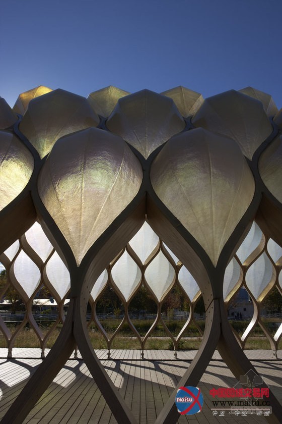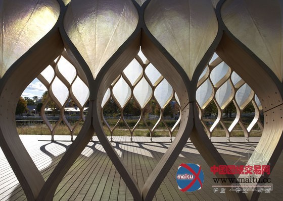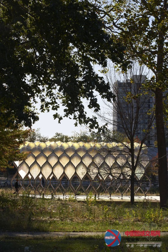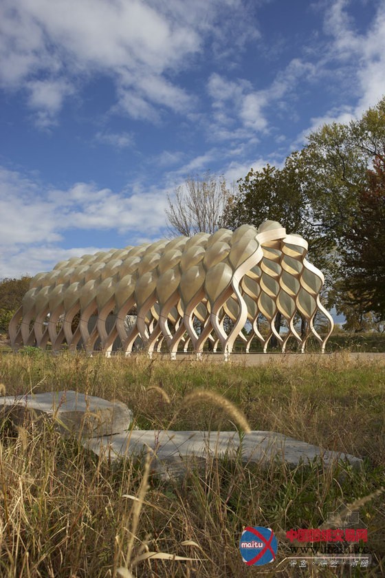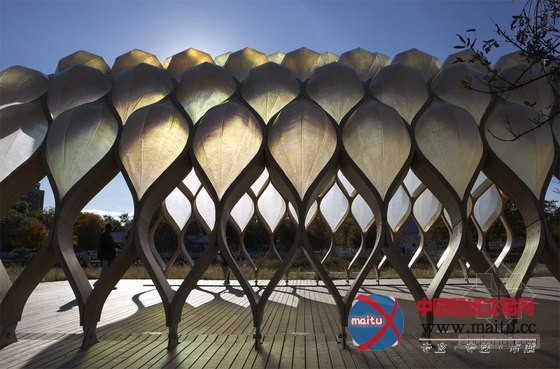 本来的南湖是一个破旧的,19世纪的城市公园水池,是动物的栖息地。林肯公园决定将水池、景不雅、周围的道路、教育馆和小亭都从头设计。经由过程栖息地和建筑设计,来具象化动物园的形象和任务。改良水质,分层景不雅,创作发现更宜居的动物栖息地。操纵木板和再生塑料牛奶瓶建造的拱形雕塑,接近水池,两个小亭子融进木栈道中,供给呵护之所。该作品灵感源自玳瑁,操纵紧密的计较,拼合了一系列预制木板,成立了一个无柱空间。