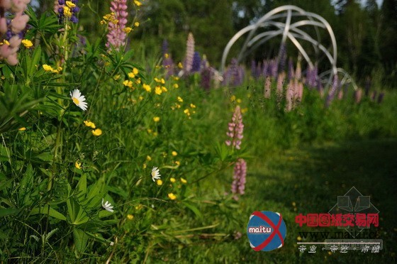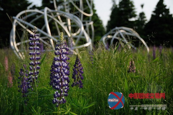 加拿大梅提斯lupine field的缠绕豆荚雕塑