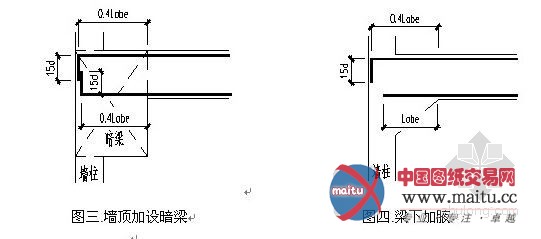 墙顶加设暗梁(图三),梁宽大年夜于墙宽并包管框架梁支座筋的程度锚固长度要求。或梁下加腋(图四)。