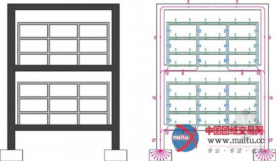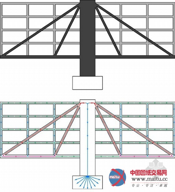 巨型框架的示意,玫红色为巨型框架的荷载流线。布局尺寸、荷载跟上面通俗布局一样,只不外改成了巨型框架。深色部门是巨型框架主布局,淡色部门是次布局。就像一个两层的巨型架子,每层各自放了一个斗室子。